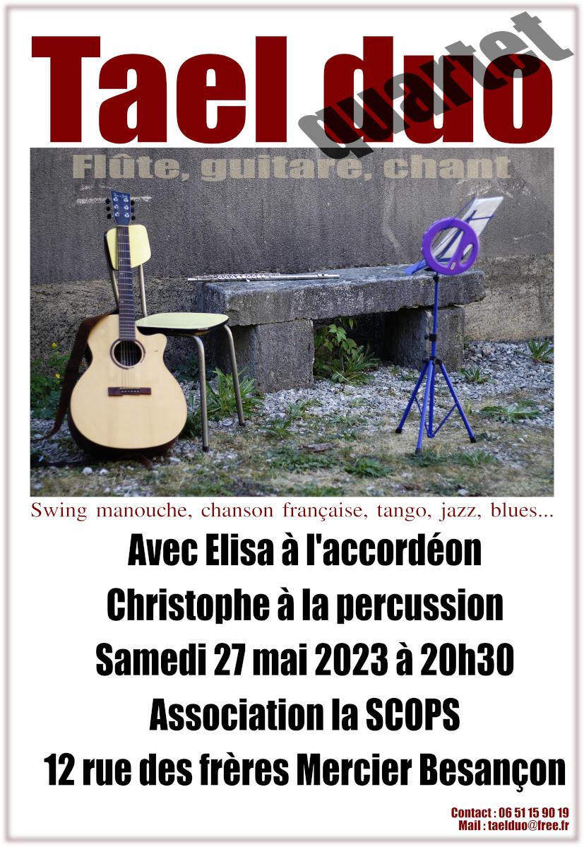Samedi 27, 19h30 : Concert de Tael Duo : chansons françaises et révolutionnaires, swings manouches, jazz, blues, valses, klezmer, tango...