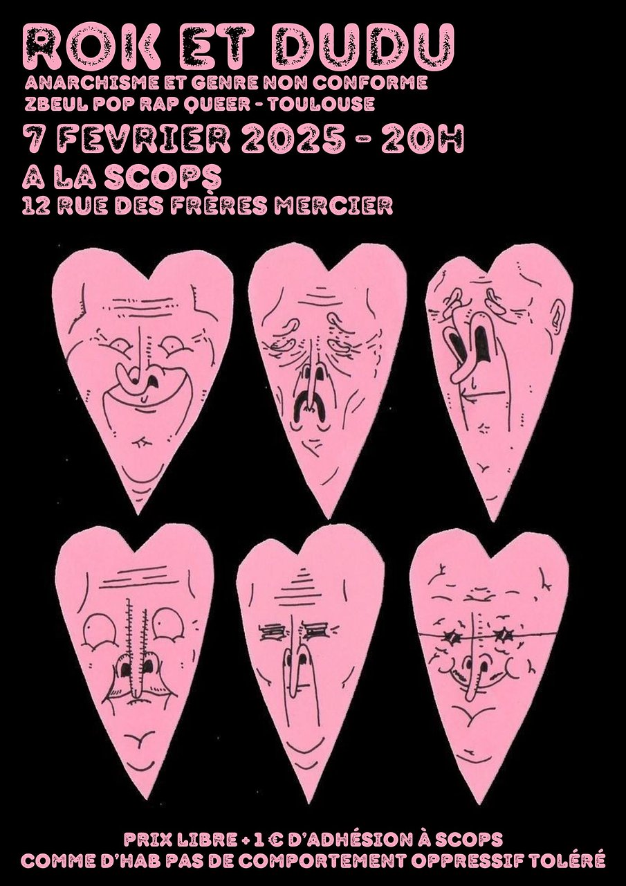 Evoluants ensemble sur les scĂšnes Queer et militantes, Rok & Dudu proposent un set aux influences Ă©clectiques, allant du rap actuel Ă lâĂ©lectro-pop, du punk Ă la techno. Sây mĂ©langent des textes engagĂ©s, sombres, Ă©mos et toujours revendicatifs, sur des prods efficaces, invitant Ă danser sur nos rages et les blessures. Que leur monde de merde nous inflige.