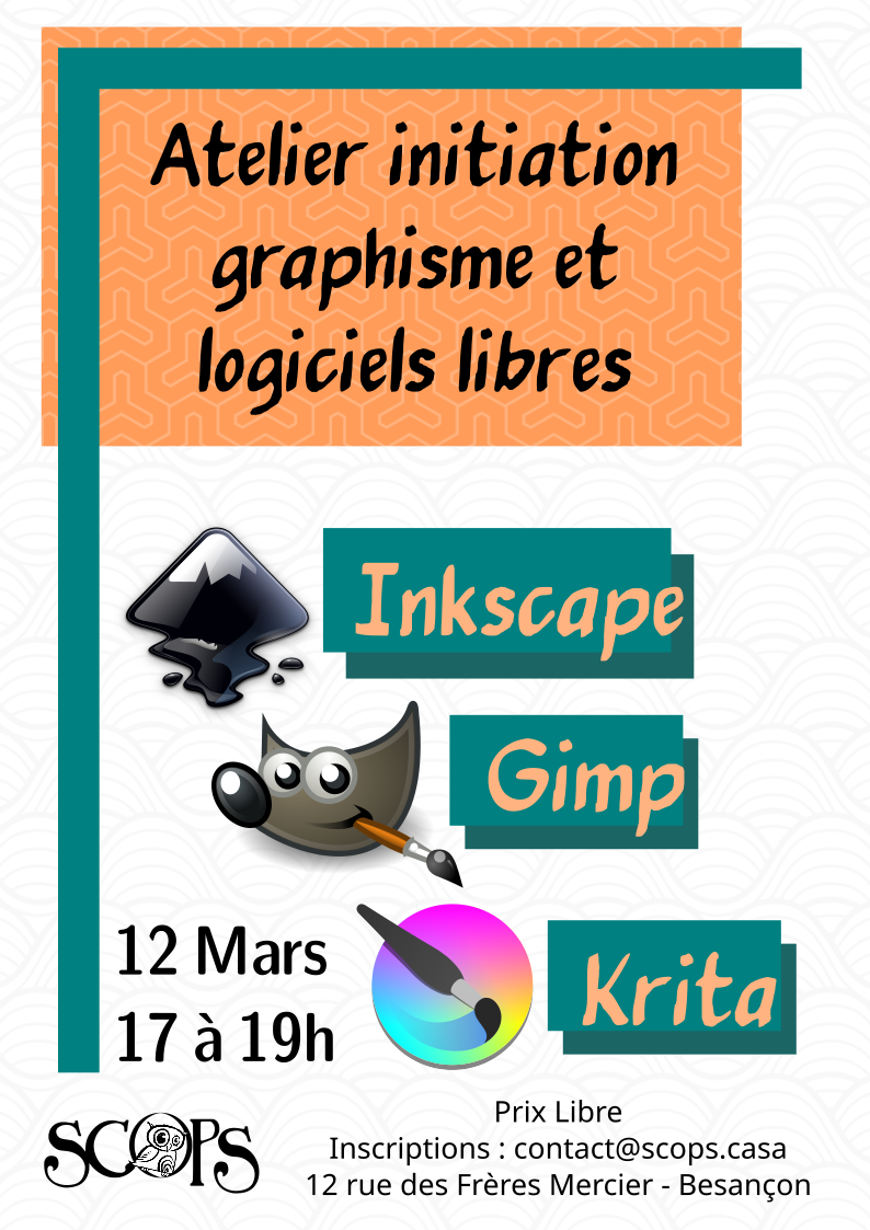 Nous ne sommes pas graphistes pros, mais au cours de cette initiation nous allons parcourir : – Les bases du graphisme numérique matriciel / vectoriel – Les formats de fichiers – Choisir les logiciels adaptés à un projet – 3 petits tutos à réaliser ensemble sur Inkscape, Gimp et Krita
