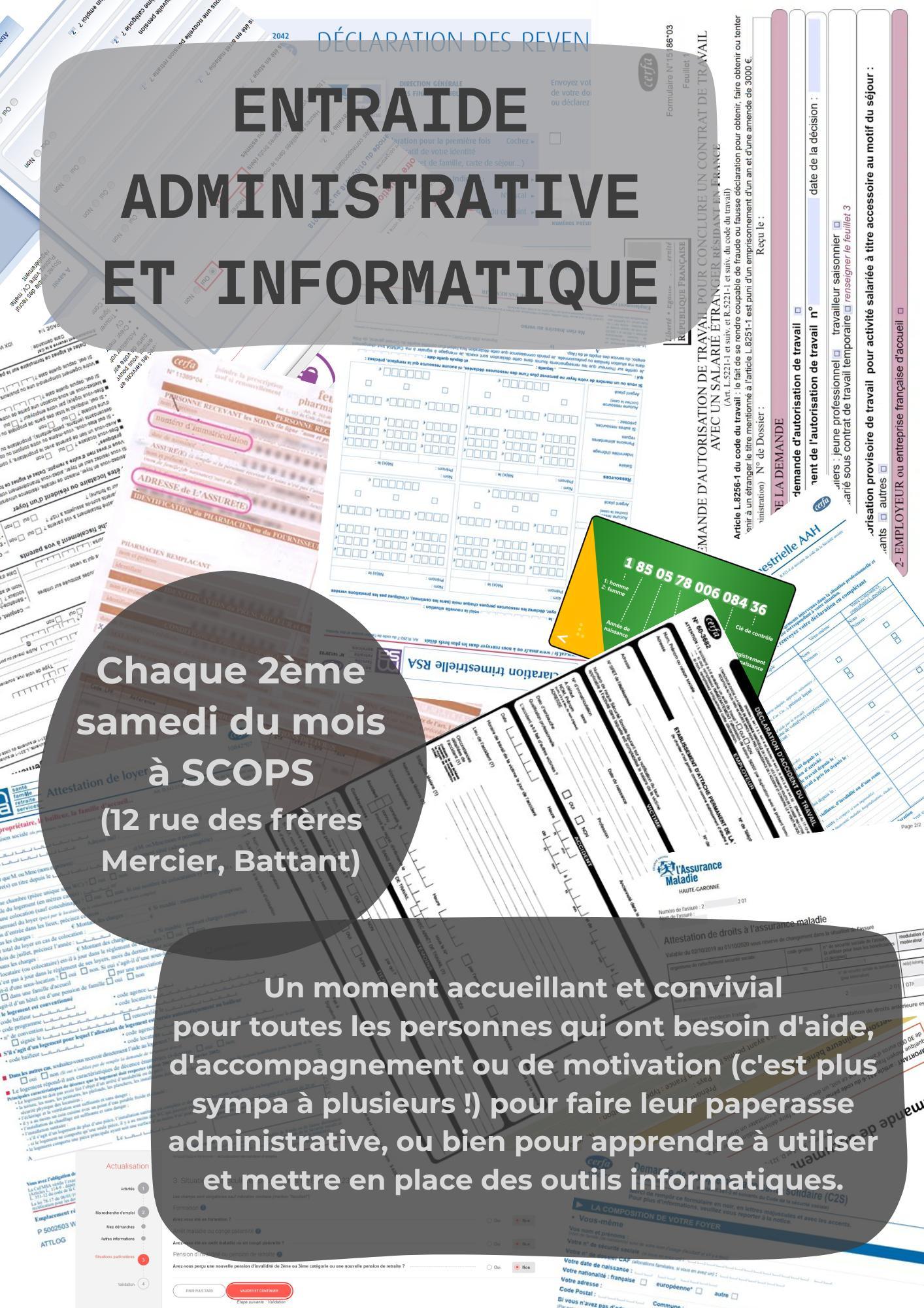 Quelques exemples d'aide administrative : remplir une demande de RSA ou un dossier MDPH, s'actualiser sur pôle emploi, imprimer ou scanner un document, écrire une lettre de résiliation...