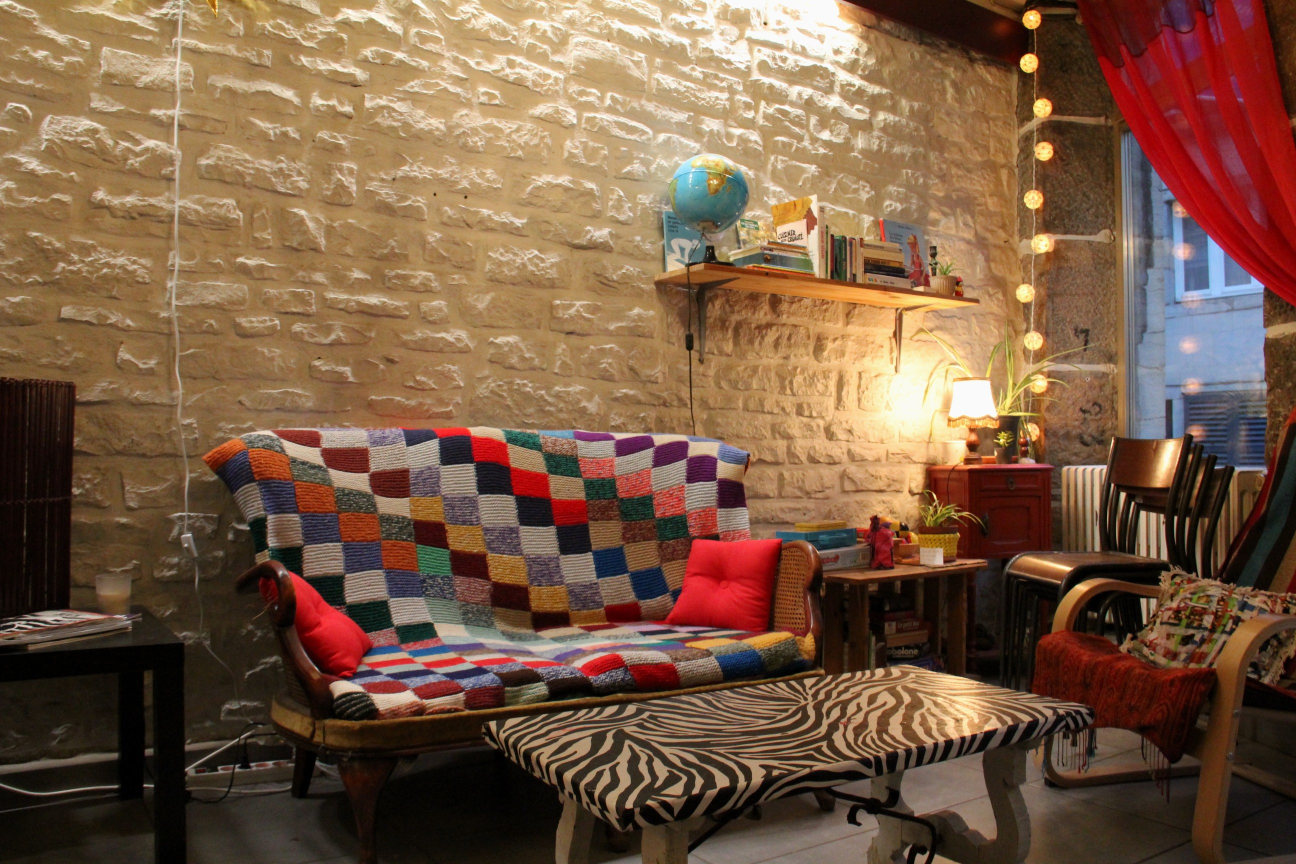 Mi-salon mi-café, la première pièce invite à se poser avec un livre, un jeu, discuter,… en sirotant une boisson… 🍻 café bio à 1€, infusion, bière artisanale ou non, sirop bio ☕ sont à se procurer au coin bar qui prolonge le salon.