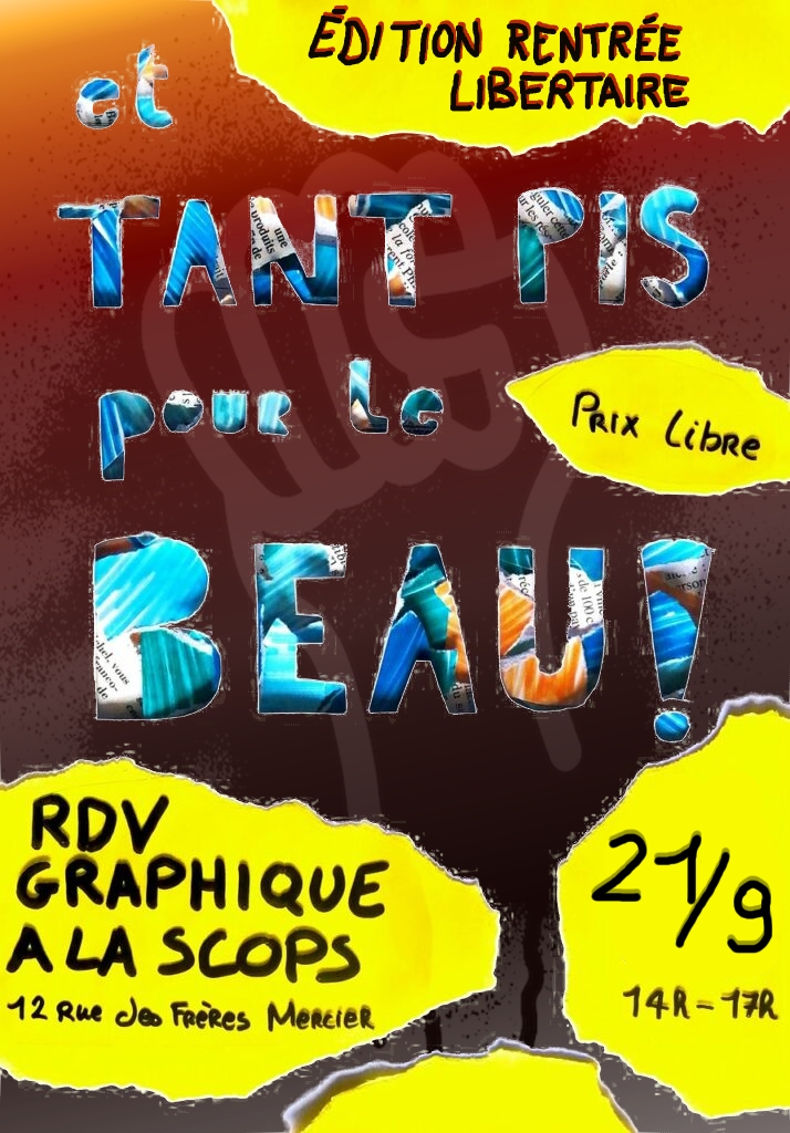 Dans le cadre de l’atelier « Tant pis pour le beau » qui a lieu à la Scops, on se propose de réaliser des affiches, des stickers et des slogans avec des messages politiques libertaires, féministes, antiracistes, etc.