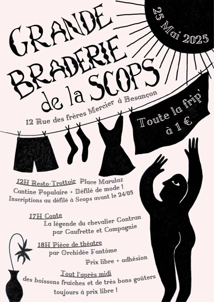 Voilà le retour de la Grande Braderie de SCOPS avant l’été ! On met la fast-fashion en PLS avec la formule « Toutes les fripes à 1€ », sans parler de tout un programme de joyeusetés :